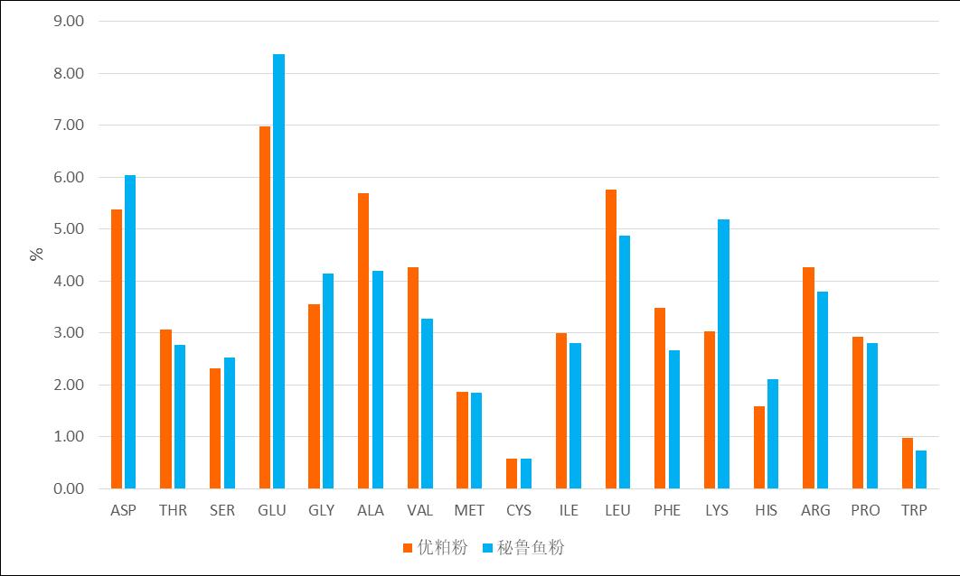 优粕粉和鱼粉的氨基酸组成比较(以92% 干物质计)
